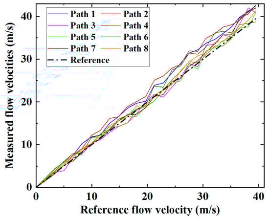 The measured velocity increased with the reference flow velocity, consistent for all eight paths. However, a growing discrepancy is observable and as expected, the measured flow velocities show a general tendency to be higher compared to the reference velocities. This is principally due to the discrepancy between the average flow velocity determined from measurements of the individual ultrasonic paths and the average velocity over the cross-section of the meter body []. Fluctuations in the data trends are observed for all paths measured at all flow rates, and a key consequence of this is that it increases the root-mean-square (RMS) deviation of the measurement results from the reference flow velocity. Since all array elements are in the vicinity of the diametral plane, the correction factor can be estimated using the correction factor for the paths travelling through the diametral plane. For a fully developed turbulent flow, the correction factor for the ultrasonic paths in the diametral plane is a function of the Reynolds number, and can be estimated by (9) [].
