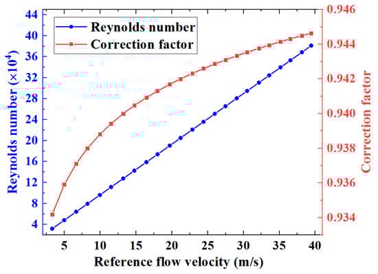 In practice, the distribution of flow velocity of fluids in a pipe cannot be considered uniform. For a steady, fully developed velocity flow free from swirl and pulsation, the velocity profile is symmetric about the axis of the pipe, and the velocity at a given point inside the pipe is a function of the distance between the location of that point and the axis of the pipe [,,,]. Consequently, a correction factor is introduced to estimate the average velocity over the cross-sectional area based on the measured average velocity along the ultrasonic path, as shown in Equations (3) and (4) [].