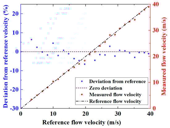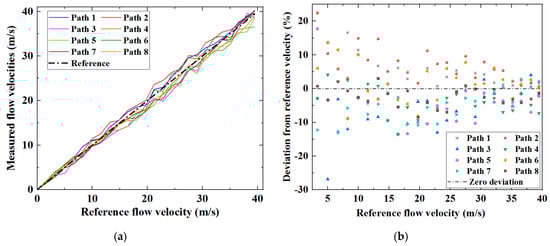 A determination of average flow velocity accounting for the measurements from the eight individual ultrasonic paths as a whole can be obtained using Equation (7). The flow velocity determined by this spatial averaging method and the deviation of this velocity from the reference are both shown in Figure 10.