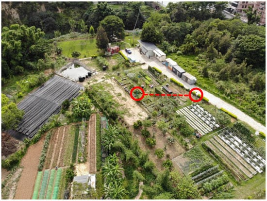 AgriTalk smart soil farming system has been deployed in several farms in Taiwan []. This paper considers farms in three locations: both the Bao and the Longtan farms are located in low-altitude areas, and the Wufeng farm is located in a high-altitude area. Figure 1 shows the aerial photo of the Bao farm. AgriTalk deploys sensors of two categories. The sensors in the air are installed in a micro weather station, including those for CO2, temperature (−40 °C–65 °C), humidity (1–100% RH), barometric pressure, and ultraviolet (0~1800 W/m2). Each AgriTalk farm has installed two micro weather stations. In Figure 1, the weather stations are highlighted by the red circles. The dashed line in Figure 1 shows that two sensors of the same types are located some distance away in the farm.