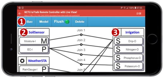Another category of sensors is comprised of those inserted in the soil, and includes moisture, temperature, electrical conductivity (EC), and pH sensors. Multiple sensors of the same type are deployed in every farm area. Several actuators are used in AgriTalk, including the drippers, the repellent bulbs, the pest sprayers, and so on. The total number of deployed sensors and actuators are over 100 in the farm fields investigated in this paper. In AgriTalk, these sensors are connected to the actuators through a web-based, user-friendly graphical user interface (GUI). The AgriTalk GUI allows for the creation of smart farm tasks in a smartphone (Figure 2). These tasks are developed in several simple AgriTalk projects. In AgriTalk, the data generated from a sensor can be used in different projects, and an actuator can be controlled by multiple independent projects at the same time.