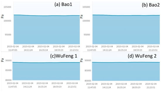 The homogeneous mutual test involves two sensors of the same type, which are not located far away from each other. An example is the barometric pressure sensor that is most stable among all sensors used in AgriTalk. In Figure 4, the barometric pressure curves are almost flat. These output readings are affected by temperature, and the relationship between pressure and temperature is described by the Gay–Lussac Law. Due to air molecule collisions, this law says that, if the air temperature is increased, the pressure decreases. Different altitudes impact the temperature effect on air pressure due to disparities in air density. At a higher altitude, a higher temperature is required for the same air pressure as that at a lower altitude.