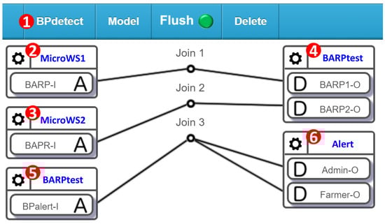 When the dripper is turned on, the MDtest starts monitoring the moisture readings until the dripper is turned off. If the irrigation system functions normally, then in a certain period of time , the moisture should increase to reach a threshold value (e.g., 40% relative humidity). If the irrigation system does not work this way, then either the moisture sensor or the dripper actuator fails, and MDalert-I in Figure 10 (5) sends the alert message to the administrator and the farmer through Join 3. Note that the Alert device in Figure 10 (6) is the same cyber device in the BPdetect project (Figure 5 (6)). When both projects are activated, the administrator and the farmer will receive alerts from both projects if any IoT devices in these projects fail.