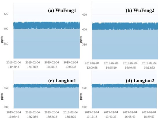Another good candidate for the homogeneous mutual test is the CO2 sensor. CO2 concentration in the air is affected by wind speed/direction, solar radiation, air temperature, rainfall, ultra-violet (UV) radiation, air pollution, and so on. Figure 6 shows that, although the CO2 concentration values produced by two sensors in the same area (Wufeng or Longtan) severely fluctuate, they are limited in small ranges with almost the same means. Therefore, these two sensors are good targets for the mutual test. If the CO2 concentrations are significantly affected by other factors (e.g., wind speed/direction), then the homogeneous mutual test with extra input factors described in Section 4.3 is conducted to better identify the failed sensor.
