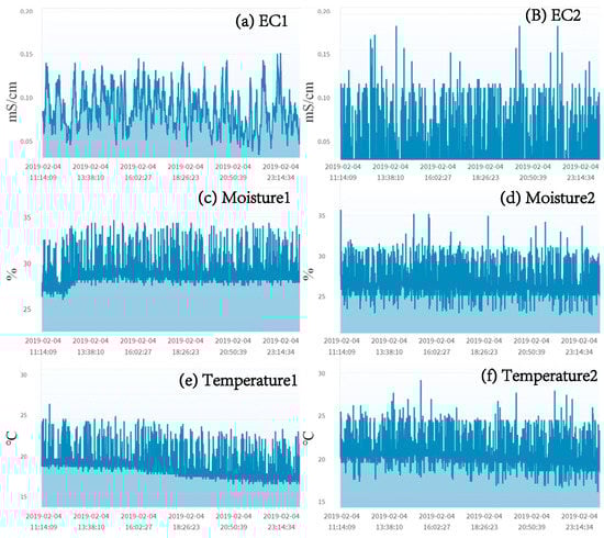 The soil sensors are good targets for the heterogeneous mutual test because in AgriTalk, the soil sensors are integrated in one piece of hardware (the so-called three-in-one sensor device for EC, moisture, and temperature). In Figure 7a,c,e are placed in one location, and Figure 7b,d,f are in another. Based on the discussion in Section 4.1 and Section 4.2, we have the following fact.