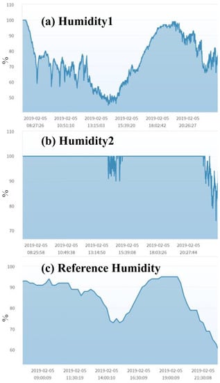 Note that, when the homogeneous mutual test shows a negative result, both sensors may fail as illustrated in Figure 8a,b. The correct readings of humidity are given in Figure 8c. In this case, both sensors should be calibrated.