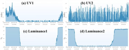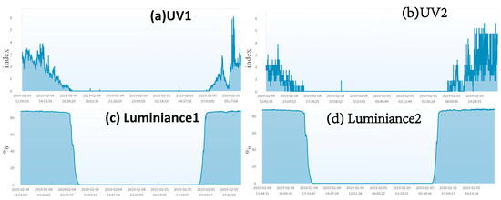 Facts 1 and 2 assume that when a mutual test indicates a positive (negative) result, Situation 1 (2) holds. In some cases, the results may only guarantee that the situations are likely to hold with some probabilities. For example, although a mutual test indicates that both IoT devices are normal, an experienced IoT expert/farmer may still doubt that a device fails. Therefore, based on the expert’s experience, a probability may be given to an observed test result. Consider the example in Figure 13. Define the following events: A = {UV1 fails}, B = {UV2 fails}, C = {Luminance1 fails}, and D = {Luminance2 fails}. Denote = {UV1 is normal} as the complementary event of A. Similarly, , , and are complementary events of B, C, and D, respectively. Let be the probability (estimated by experienced experts) that the event occurs (Situation 2 of Fact 1), Similarly, , and . It is clear that is the probability that Situation 1 of Fact 1 occurs. Therefore,