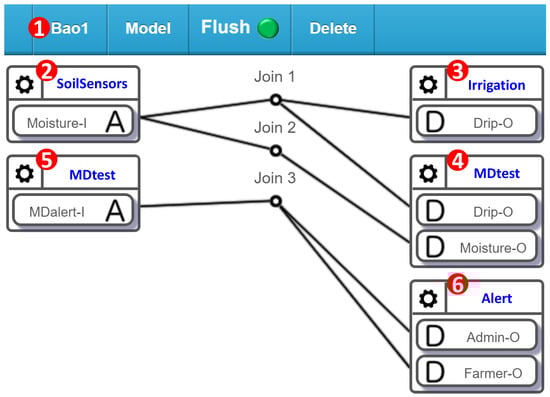 In AgriTalk, every sensor affects at least one actuator. In [] and the references therein, faults have been detected in the sensor and actuator interaction. If a sensor is used to control an actuator, then they are highly related and can be paired to mutually test each other. For example, in the AgriTalk irrigation system, the dripper is controlled by the moisture sensor as illustrated in Join 1 of Figure 2. Therefore, the moisture sensor and the dripper are highly related, and the heterogeneous mutual test can be performed by modifying the Bao project in Figure 2. The new project is called Bao1 (Figure 10 (1)), which is a subproject of the irrigation control system that only involves the moisture sensor (Moisture-I in Figure 10 (2)) and the dripper (Drip-O in Figure 10 (3)). We create a cyber test device “MDtest” (Moisture-Dripper tester) that has two ODFs and one IDF. In the output device (Figure 10 (4)), Drip-O receives the instruction sent from Join 1. Therefore, when it receives the value “1,” the MDtest knows that the dripper is turned on. When Drip-O receives the value “0,” the dripper is turned off. Moisture-O receives the measured moisture data through Join 2.