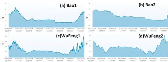 Both homogeneous and heterogeneous mutual tests identify that the tested sensors may fail but cannot determine which of the two sensors fails. If heterogeneous and homogeneous mutual tests are combined, then it can be considered as a “homogeneous test with extra input factors.” In other words, in the combined mutual test, there are two same-type sensors under test, and different types of sensors or actuators can be used as extra input factors that assist in identifying which sensor fails. An example is the temperature sensor test in AgriTalk. Figure 12 shows the temperature readings of two micro weather stations in each of the Bao and the Wufeng fields. The figure indicates that the two reading curves in the same field are correlated. Therefore, the homogeneous mutual test applies to air temperature sensors. As we pointed out in Section 4.1, air temperature affects other air sensors, in particular, barometric pressure. If the readings of a barometric pressure sensor are correct, then they reflect the impact of the air temperature. In a mutual test of temperature, the temperature sensor with more accurate readings will relate better with the readings of the barometric pressure sensor. Therefore, an accurate barometric pressure sensor can be used in a mutual test to produce better results. In Figure 12, the temperatures in Wufeng are lower than that in Bao. At the same time, the barometric pressures in Wufeng are also lower than that in Bao as illustrated in Figure 4. Therefore, by conducting two homogeneous mutual tests and two heterogeneous mutual tests, there is a much better opportunity to identify the failed sensor.