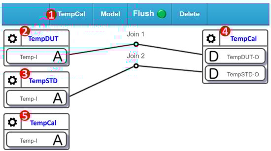 After a failed sensor is found, either it is replaced or is calibrated. In the latter case, a standard sensor is used to build a mapping table to adjust the characteristic curve of the sensor under test. The sensor calibration in the laboratory is given in Section 3 (Lines 153–178). The beauty of SensorTalk is that it is able to perform the exact laboratory calibration procedure in the farm field. In AgriTalk, a failed sensor is manually replaced. The manual operation for sensor calibration is exactly the same as sensor replacement, except that we need to create a calibration project in the AgriTalk GUI (Figure 14 (1)). The TempDUT device (Figure 14 (2)) includes the temperature sensor to be calibrated (i.e., Temp-I) or the so-called “device under test” (DUT). AgriTalk provides a standard temperature sensor in the TempSTD device (Figure 14 (3)). Both the DUT sensor and the STD sensor are connected to the temperature calibration cyber device “TempCal.” When the paired (DUT, STD) values are sent to the input device of TempCal, they are saved as a mapping entry in the calibration table. The STD values are also sent out to control the AgriTalk actuators through Temp-I of the TempCal’s input device (Figure 14 (5)).
