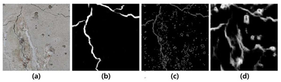 (a) The original concrete surface, (b) the crack map manually traced by an expert, (c) edge detection by Sobel mask, and (d) by Holistic Edge Detection (HED) [9].