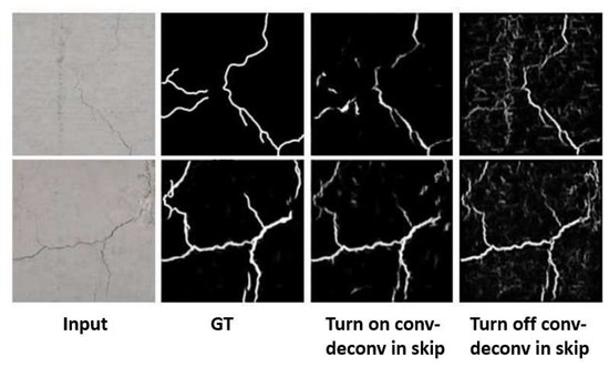 Motivated by the work in our algorithm, the architecture is designed to combine the output feature map of a convolution layer with that of the corresponding deconvolution layer at the symmetric position. The skip connection is made using internal convolution and deconvolution operations in our algorithm. To be specific, as zoomed in Figure 3, we apply a convolutions layer using kernel size 2 and stride 2 for the internal convolution operation in the skip connection, so we have the half size of feature map as . For the deconvolution operation in the skip connection, we use a deconvolution layer using kernel size 8 and stride 2 to recover the original feature size . Afterwards, they are concatenated with the existing layers in the deconvolution layers of the CCA. By doing so, the contexts trained in the convolution layer cannot be missed and maintain the important characteristics of real cracks. We also show the ablation tests turning on and off the convolution and deconvolution layers of the skip connections in testing procedures. When turning on the operation, the network can focus on the actual cracks. In the opposite case, it shows other noise components when turning off the function, as shown in Figure 4.