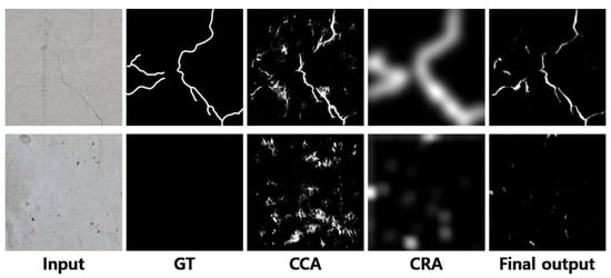 The features trained in CCA and CRA are the same before pooling layer 3 in Table 1 and Table 2, but the feature maps that have passed through the CCA and CRA networks are further computed with element-wise multiplication and additional one 1 × 1 convolution layer to precisely output the map of cracks, as shown in the final output of Figure 5. Figure 5 shows examples of input images and the ground truth and the intermediate outputs of the CCA and the CRA and the final output from the left to the right. The output values of the CRA are adjusted to have the maximum pixel value of 255 in the examples for the purpose of visual comparisons, while they are actually filled with some small values. The features trained in CCA capture detailed edges in concrete surfaces, but the results can include a lot of edges, blobs, and lines. Meanwhile, the CRA cannot extract detailed patterns as shown in the fourth column, while being capable of determining whether the region is important or not. When combining the results, the crack is appropriately extracted in the output. For instance, the input in the second row has none of important cracks, and accordingly, the output map becomes empty even though the CCA points several low-level edge features in the image.