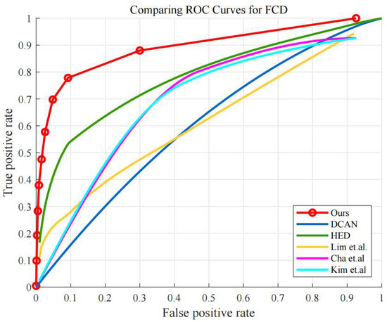 We examine the performance with receiver operating characteristics (ROC) curves and the corresponding area-under-curve (AUC) values. Figure 9 shows the ROC curves using FCD dataset, comparing the performance of the proposed algorithm denoted by “Ours” and the other conventional algorithms. As shown in Figure 9, the proposed algorithm outperforms all the other conventional algorithms. The AUC value of “Ours” is 0.904 while HED, DCAN, Lim et al., Cha et al., and Kim et al. are 0.779, 0.602, 0.617, 0.626, and 0.620, respectively.