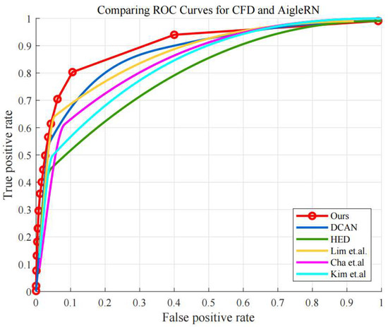 Moreover, Figure 10 shows the ROC curves using CFD and AigleRN datasets. As can be seen, the proposed algorithm also provides better detection performance than the other algorithms, while the DCAN shows comparable performance. Quantitatively, the AUC values of the proposed algorithm is 0.910, while those of the HED, DCAN, Lim et al., Cha et al., and Kim et al. are 0.795, 0.872, 0.867, 0.843, and 0.830, respectively.