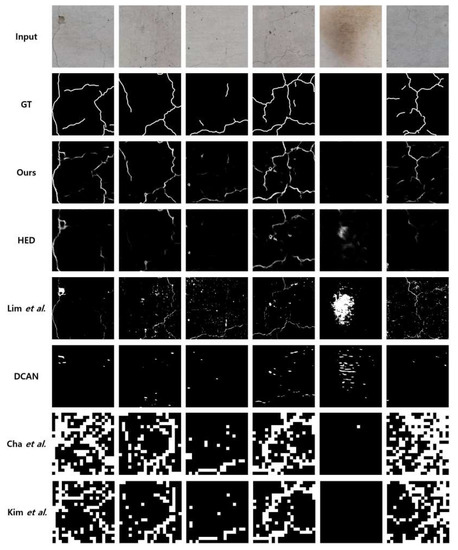 We perform the visual comparisons in Figure 11. A larger pixel intensity represents a higher probability of crack information in the position, determined by each algorithm. The FCD dataset has a number of image patches including stains and noise that occurred at the fire experiments, so it has challenges distinguishing the noise components and the actual cracks. As shown in Figure 11, the proposed algorithm provides better results that are closer to the ground truth, even though some cracks, e.g., in the sixth column are not detected properly. However, the other algorithms also fail to detect the cracks. Actually, the crack detection algorithms are not much efficient when the cracks are not noticeable compared to the background. As compared to Lim et al.’s method, the proposed algorithm is more robust regarding color changes. For instance, in the fifth column, when there is no crack beside stains in the image patch, the proposed algorithm outputs empty crack information. However, Lim et al.’s method outputs some amounts of false positive errors. As compared to HED and DCAN, the proposed algorithm detects the cracks better. Both Cha et al.’s method and Kim et al.’s method have similar results because they include similar classification processes done by CNN. The difference is only the use of the probability map measuring the confidence in the existence of the crack. In Kim et al.’s method, they used soft-thresholds once the block is classified. However, they predict many image patches to cracks in common, especially when the datasets contain noise. For this reason, though both of them provide higher recall values, the precision values become significantly lower, which results in significantly degraded overall accuracies in detection.