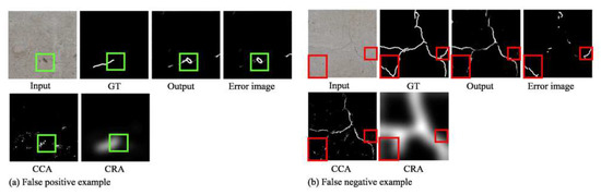 In Figure 13, we point out the false positive errors and the false negative errors in the proposed algorithm, by subtracting the ground truth from the output images of the proposed algorithm to obtain the error images. The green boxes represent the false positive errors, and the red boxes represent the false negative errors. For instance, in the first row of Figure 13a, the concrete image has some holes on the surface, and it is observed that the edges of the cavity are mistakenly detected as cracks. The second row of the Figure 13a is CCA and CRA output image of the first test input image. Through the CCA network, all large and small holes were detected. In the CRA, all small holes were ignored, but large holes were recognized as group of edges and detected as crack regions. As a result, large holes were detected incorrectly.