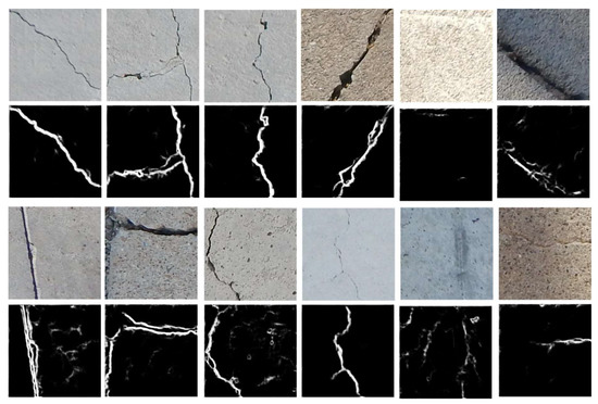 The main challenge in crack detection is to identify only the important cracks whose widths and lengths are greater than some thresholds, specified by a safety instruction [5]. Earlier crack detection algorithms use edge detection and morphological image processing algorithms such as Canny detector, Sobel mask, and Laplacian of Gaussian (LoG) [6,7,8]. However, many noises or other tiny pores and scratches on the surfaces make cracks difficult to be detected in the real world. The task is even more challenging when the surfaces of concretes are damaged by various factors [9,10,11,12,13,14]. For instance, Figure 1 shows parts of fire-damaged concretes. The detection accuracy is significantly degraded by combustion as compared to the cracks pointed by domain experts. Many image processing algorithms are actually sensitive to such noise and undesired artifacts by damages.