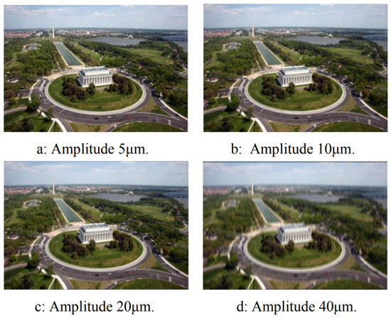 There is not a significant number of studies about the effect of sUAS vibration on image quality. Li and Tan [13] investigated the effects of sUAS vibration on Binary Optical Elements (BOE). BOE is a diffraction imaging element and the diffraction efficiency can be impinged by the vibration of the platform, affecting the image quality. In other words, the relative position between the object point and the optical system changes by the movement of the platform, deteriorating the quality of the image. Therefore, the study simulates the effect of one dimension sinusoidal vibrations with different amplitudes and frequencies on an image with pixel size of 9 μm and integration time of 20 ms (Figure 1). First, different amplitudes at a constant frequency of 50 Hz are applied (Figure 2). For 5 μm of amplitude, no significant changes on the quality can be noticed. For 10 μm of amplitude, the image quality is affected; however, a more significant degradation is noticed on the edges of the image than in its center. For 20 μm of amplitude, the whole image gets blurred, and, for 40 μm of amplitude, the image quality is heavily affected.