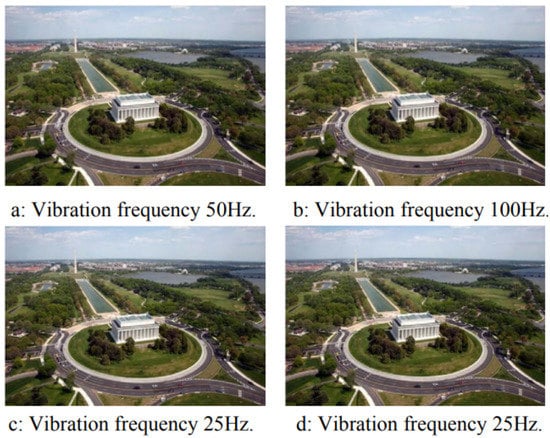 Figure 3 shows the result when the same vibration amplitude (15 μm) is applied to the image, but with different frequencies. There are no significant differences between the images in Figure 3a,b. The conclusion is that, when a vibration period is lower than the integration time, increasing the vibration frequency has little effect on the image quality. The images in Figure 3c,d have the same frequency and amplitude, but the vibration was applied on different moments. This may be due to the varying speed of the camera during sinusoidal vibration. This means that, in the case of low-frequency vibrations, the resulting image quality can be different for different time periods since the phase between the vibrations and the image integration period is likely to shift randomly during a flight.