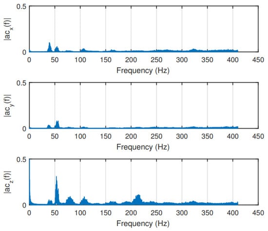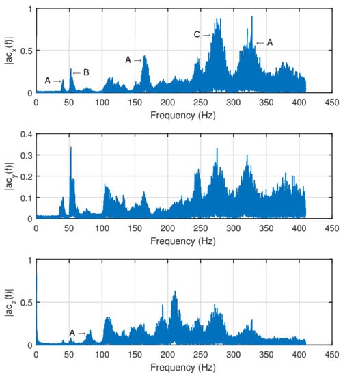 To study the effect of the dampers on the sUAS vibration mitigation, a structural vibration analysis was done before the installation of the dampers. In the first step, the sUAS structure was modeled in SolidWorks simulation, considering also the materials properties. The frequency analysis was carried out and the high vibration frequencies observed were 39.90 Hz on the x- and y-axes, and 80.48 Hz on the z-axis. Similar behavior also existed for 160.17 Hz and 321.82 Hz, respectively, which the author suspected were the third- and fourth-mode natural frequencies, related to the payload. Small vibrations were obtained between 100 and 200 Hz and a stronger one at 273.16 Hz. The last ones were probably related to the structure, such as arm extensions and components. After the simulation, flight tests were performed and the vibrations were measured by an additional IMU with a sampling rate above 800 Hz. The results (Figure 7) show that the vibration data obtained on the flight tests was very similar to the simulated one. Peaks (A) related to the payload were verified on the vibration frequencies of 40, 80, 160 and 320 Hz, a peak (C) related to the structure was verified on around 270 Hz, and another peak (B) was verified on around 50 Hz, which is related to the rotation of the rotors. The last one was not verified in the simulations because the vibration related to the rotation of the rotors was not included on the simulated model.