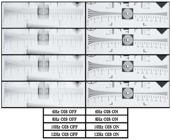 In imaging missions, an alternative or supplement to mechanical vibration mitigation is Optical Image Stabilization (OIS) [22]. This technique consists of using motion sensors readings to detect vibration and to move the lens or sensor in order to correct the jitter. Nowadays, many camera systems, especially the ones installed on the most modern phones come with this capability. Basically, actuators move the camera system parts according to the detected vibrations, cancelling the effect. OIS is considered superior to digital image stabilization as it acts before the image acquisition and therefore there is no image distortion or degradation. Despite its advantage, not all imaging systems have this feature and the installation of OIS on the existing imaging systems is very challenging as the intervention happens in the hardware of the imaging system. OIS can also alter camera parameters, reducing the accuracy of remote sensing data. Li et al. [23] evaluated the performance of an OIS system using fuzzy sliding-mode controller under the effect of sinusoidal signals of 6, 8, 10, and 12 Hz. The camera acquired images of a standard ISO-12233 chart with OIS ON and OFF. Figure 9 shows the comparison between the chart picture taken from a camera with and without OIS turned on for vibrations of ±0.15 degrees on the vertical axis.