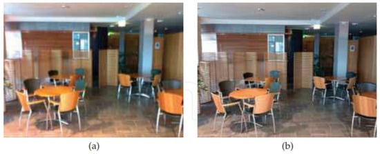 (a) Non-stabilized image taken with exposure time of 1.8 s; and (b) stabilized image by fusing four frames with exposure time of 0.3 s each [24].