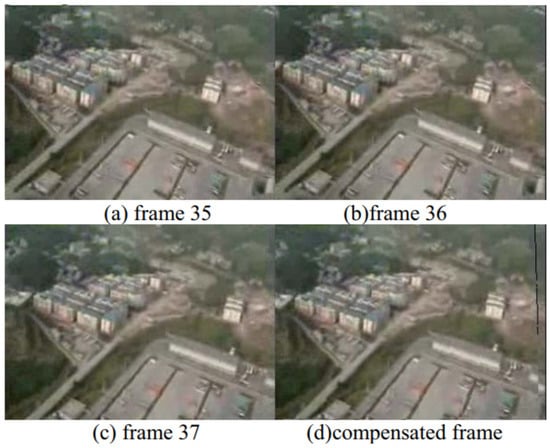 A fast video stabilization for sUAS was proposed by Shen et al. [29]. A polynomial fitting and predicting method was proposed to estimate the global motion parameters and to select undesired frames. After that, the undesired frames are compensated and all frames are transformed to obtain stabilized images. Figure 11 shows the compensation (Figure 11d) of an undesired frame (Figure 11c).