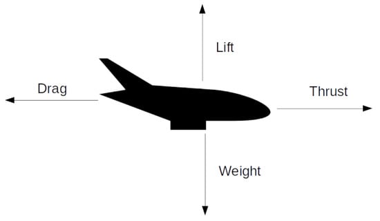 Aerodynamic forces acting on an airplane—thrust, lift and drag.
