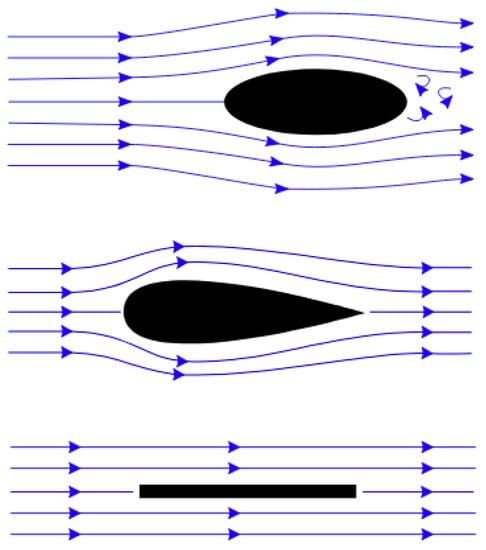 Figure 13. Flow visualization over different shapes (modified from MikeRun/CC-BY-SA-3.0). - Skin friction drag: As air moves over the surface of the body, close to the surface the flow will lose energy due to viscous effects. This type of drag is called skin friction drag. A turbulent boundary layer that is induced by a rougher surface may stay attached longer than a laminar boundary layer, thus reducing the form drag. This generally holds true for smaller object in relatively low air speeds [21]. Therefore, for smaller objects, the negative effects of higher skin friction drag, which is caused by a rougher surface, may potentially be offset by a lower overall profile drag. Finally, it should be noted that such potential benefits are highly dependent on the specific design and flow conditions, and therefore require an in-depth aerodynamic analysis. Projects where such analyses is not within reach may benefit from focusing on the form drag and interference drag instead.