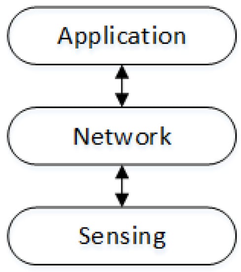 There are several alternatives for structuring the IoT interaction scenario; however, most of them implement a three-tier architecture that involves the sensing, network, and application layers [] (Figure 1). This architecture is devised to coordinate the functionality of the nodes in order to obtain an integral behavior of the system, through the integration and coordination of its parts. This structure is not related to the traditional five-layer Internet model; in fact, any IoT system should count with transport, network, and link layer-nested protocols to operate in the open Internet network.