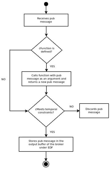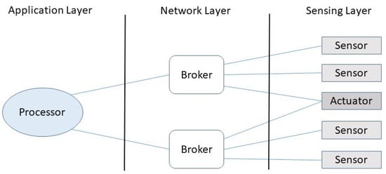 Finally, the processor nodes usually increase the intelligence of the system using the services provided by the brokers. Like the previous case, a processor can be linked to multiples brokers and vice versa. Processors are implemented in the application layer. The management of events in this layer usually adheres to the publish–subscribe model [,]. Unlike client–server or request–response coupling models, publish–subscribe facilitates the inclusion and exclusion of devices and also the dynamic orchestration of services provided by the nodes, making the systems more flexible and easy to evolve [,].