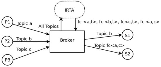 When a subscription requires data that is not present in the broker, the IRTA may ask the linked brokers to determine if they have a publisher satisfying the subscription. If there is such a broker, the IRTA may pass through the request to that broker, acting as a simple switch between the subscriber and the new pair broker/publisher. The function of searching the topic in another broker is notated as , in which a is the original broker and b is the new broker.