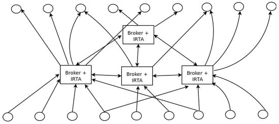 Figure 4 illustrates an example of the general structure of the interaction scenario, considering an architecture with four interconnected brokers. For simplicity, publishers are in the bottom while subscribers are in the top of the figure. As shown in such a figure, several publishers share their topics with different brokers, and various subscribers receive topics from different brokers. In the middle, brokers share data as publishers and subscribers indistinctly based on the functionality required for each connection.