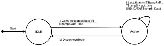 As mentioned before, the terminals correspond to the publishers in the publish–subscribe pattern. The behavior of these components is simple since, while connected to a broker, it mainly uploads data with a given periodicity. Figure 5 shows the finite state machine for the terminal. The only modification that has to be incorporated within the data is the timestamp and the period. This information is used by the broker to keep updated the delay between the publisher and the broker and to evaluate if the data will potentially arrive before the deadline to the subscriber.