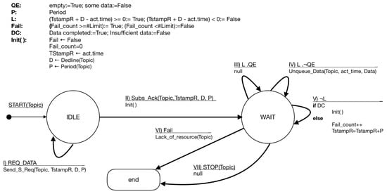 In the case of the processors (i.e., the subscribers), their behavior has to deal with timestamps and deadlines. As it can be seen in Figure 6, the processor connects to the broker and remains connected while this latter forwards data received from the terminals. In the first state, the processor is IDLE waiting for an activation from the software application controlling the IoT scenario. Once the application requests data to the processor, REQ_DATA, it sends a SEND_S_REQ(Topic,TStampR,D,P) to the corresponding broker. The parameters identify the topic, the actual time of the request, the deadline, and the period. The topic is a variable used to identify classes of requested information (e.g., weather, traffic, or pictures of surveillance cameras). When the broker accepts the subscription, Subs_Ack(Topic,TStampS,D,P, the processors goes to the WAIT state.