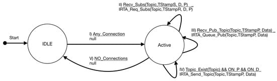 Next, we specify the behavior of the terminals, processors, and brokers using a finite state machine (FSM). We assume the connection among these components is already established; therefore, their behavior specifications are focused mainly on the exchange of data messages. In the case that a certain node operates like terminal or processor (i.e., publisher or subscriber), it may assume both operating modes, switching between them according to the role played in the system operation.