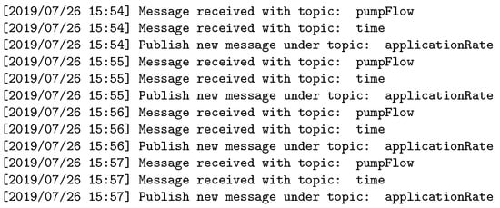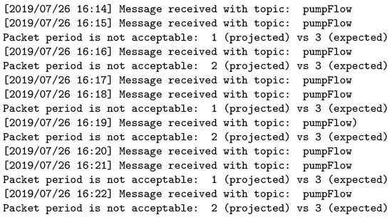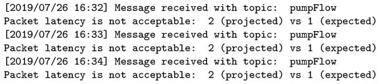 Following a different approach, Aziz [] proposes a formal method for representing and analyzing an IoT communication infrastructure. The correctness of the communication model representation is evaluated using formal methods, and the implementation of the system uses a publish–subscribe paradigm analyzed based on the MQTT protocol []. Although in this proposal the time constraints are considered as a variable, the author does not provide a mechanism to validate the time requirements of the system.