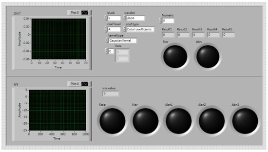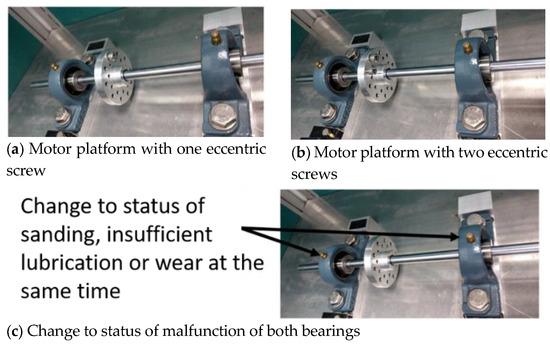 LabView captured the signals from the myRIO and transferred them to the PC terminal, for computation and classification through global variables. The graphical user interface (GUI) is shown in Figure 2. Six status conditions were used: (1) normal; (2) motor platform with one eccentric screw; (3) motor platform with two eccentric screws; (4) sanded ball bearings; (5) insufficient lubrication; and (6) worn ball bearings (see Figure 3).