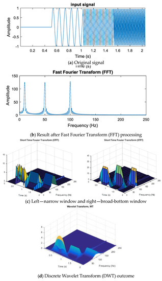 FFT, STFT, and DWT were introduced in the preceding paragraphs, and the three respective outcomes are now presented in Figure 5. The input chirp signal is shown in Figure 5a. It is obvious from Figure 5b that FFT cannot present the linearity of a chirp signal. Furthermore, an apparent dilemma can be seen in selecting an appropriate window of analysis on time and frequency for STFT in Figure 5c. Figure 5d shows the wavelet transform that can be finally acquired.