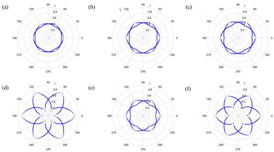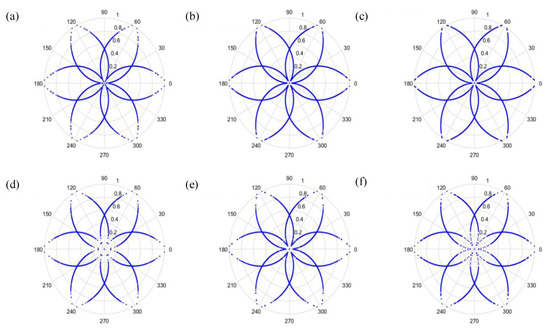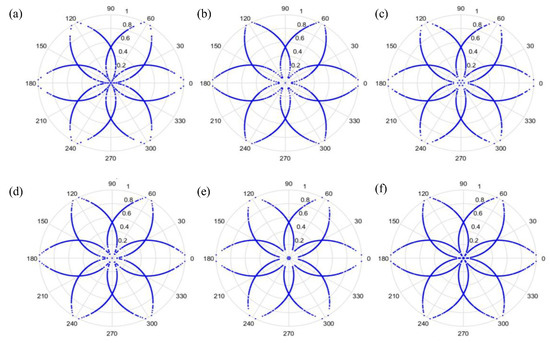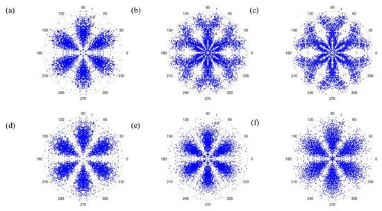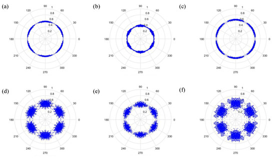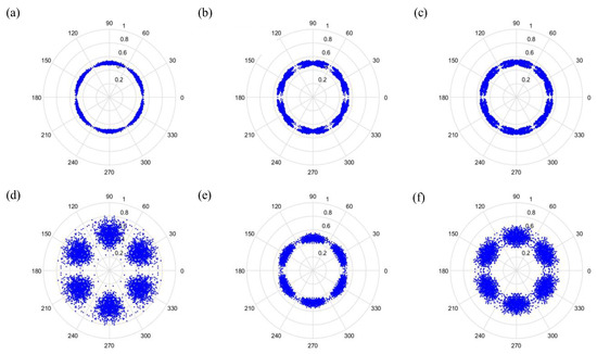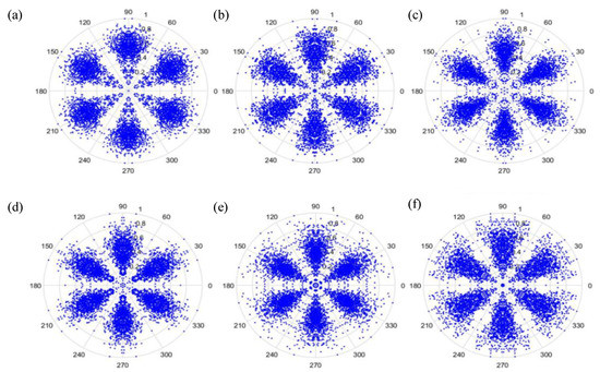 As can be seen from Figure 6 and Figure 7, the dots are over-dispersed, and it may be difficult to spot the features of this picture via deep learning (DL). Furthermore, the maximum value, H, in the experimental data is between 0 and 1, and the minimum value, L, in the experimental data is between 0 and −1, and the answers gained from the formula are located between 0 and −1. In addition, are mostly known values to the second decimal place, and, as a result, the value of is almost determined by . The signal features can be fixed within a certain scope, in order to allow the dots in the picture to concentrate and be representative of the features, to allow better CNN identification. The radius after adjustment is shown in Equation (28), and the results are shown in Figure 8 and Figure 9.