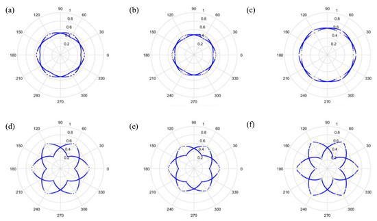 Additionally, we studied the methods of SDP to obtain the visual image for the input of the CNN model. Figure 14 and Figure 15 show the results of the original radius formulas under the conditions of a sampling frequency and rotational speed at 3000 Hz/2000 rpm, when the time-delay is 0 or 1. Figure 16 and Figure 17 show the results of the improved radius formulas under the conditions of a sampling frequency and rotational speed at 3000 Hz/2000 rpm, when the time-delay is 0 or 1.