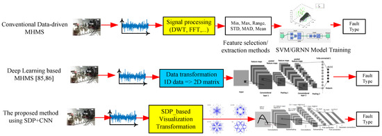 Comparison between the conventional data-driven machine-health monitoring systems (MHMS), the deep-learning-based MHMS, and the proposed method.