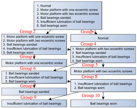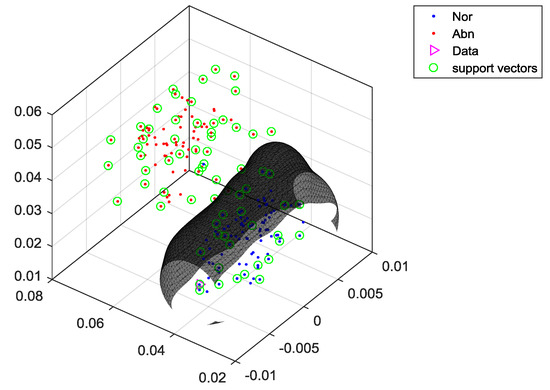 SVM was used for classifying the machine status, using three major testing methods. They are the internal-training (Test 1), the half-external test (Test 2), and the external test (Test 3). For the half-external test, half of the samples are used in the training of the SVM, but all the samples are used for testing. The external test represents that half of the samples are used for training, but the other half are used for testing. For the proposed SVM method, we used multistage classifiers, and there are five SVM classifiers in this case study. The first SVM classifier can separate the whole data into two groups, which are the normal state (Group 1) and the fault states (Group 2). Figure 11 shows the hyperplane of SVM, using the features (mean, standard deviation, and median absolute deviation) to separate Group 1 (the normal state) and Group 2 (the abnormal states). For the abnormal states (Group 2), there are five different faults: (F1) motor platform with one eccentric screw, (F2) motor platform with two eccentric screws, (F3) sanded ball bearings, (F4) insufficient lubrication, and (F5) worn ball bearings. The second SVM classifier separate Group 2 into Group 3 and Group 4. Group 3 represents that the motor platform with one eccentric screw. Group 4 includes four faults, which are motor platform with two eccentric screws, sanded ball bearings, insufficient lubrication, and worn ball bearings. Therefore, the first two SVM classifiers can extract out the normal (N) and the first type of fault (F1). Consequently, the third SVM classifier can separate Group 4 into Group 5 and Group 6, and it extracts the second type of fault (F2); the fourth SVM classifier can separate Group 6 into Group 7 and Group 8, and it extracts the second type of fault (F3). Finally, the fifth SVM classifier can extract F4 and F5 from Group 8. After the above classification processes, we can separate each status of the machine into six groups, as follows: