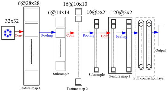 The classical LeNet5 model is used for the classification of the faults based, and its architecture is shown in Figure 13. There are three layers of feature map, with a set of units whose weights must be identified. The first layer is the first feature map, which comprises a convolution layer. The second layer is the subsample layer, which uses the max-pooling operation. There are 6, 16, and 120 feature filters in the first, second, and third feature map layers, respectively. The next two layers after the three-feature map are full-connection layers, which prepare features for classification. The last layer is a logistic-regression layer, which uses the SoftMax method for classification. The weight in each layer is randomly initialed and trained for optimization. After training, the test samples are input into the logistic-regression layer, whose output comprises class labels corresponding to the samples.
