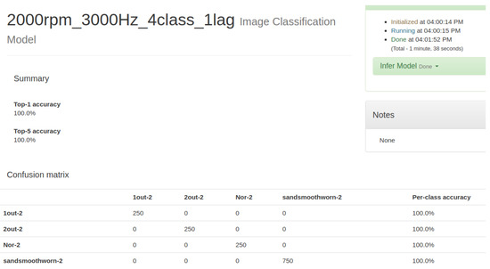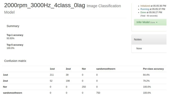 The most significant signal features generated at 2000 rpm were transformed into pictures and brought into CNN for teaching and classification, in order to obtain an adequate sampling frequency, radius, and time-delay coefficient. This allowed comparisons to be made between different sampling frequencies, radii, and time-delay coefficients; the results are in Table 5. It is obvious from an examination of the table that the accuracy due to the improved radius formula rose substantially. When the sampling frequency is higher, more features can be obtained, and classification is much better. When the time-delay coefficient is 1, the rotational angle of the nth dot will be mapped at the (n + 1)th dot. This means that whenever a time-delay coefficient exists, the dots in the picture will spread outward, to both the left and the right, to make the feature much clearer than can be obtained without a time-delay coefficient. The higher the sampling frequency, the more accurate the results will be, because the higher sampling frequency makes the features more obvious.