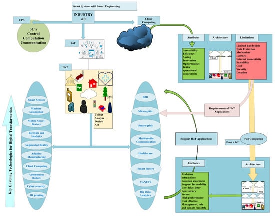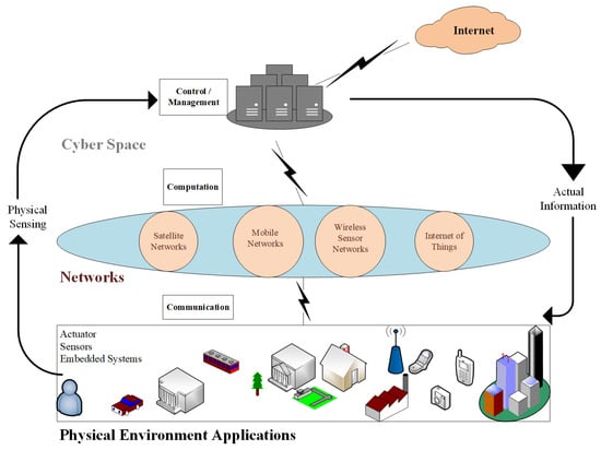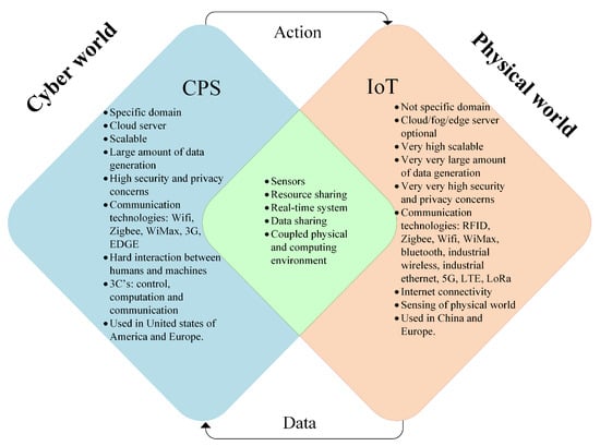 The Industry 4.0 environment is comprised of the Internet of data, Internet of things, Internet of people and Internet of services. Interface of Industry 4.0 with existing smart infrastructure such as smart buildings, smart homes, smart grids, smart logistics, social web, and business web build a CPS system. This revolution will merge the real and virtual world on the basis of CPS. A CPS system has a computer-based algorithm that integrates the Internet and its users. It is simply digitization, in which these systems make connection of information technology with electronic/mechanical device components that exchange information among each other using a network. Using computer-based algorithms, CPS brings software and hardware components working in an automated and controlled manner to perform a certain task without human’s assistance. The basic visualization of a CPS is given in Figure 4. After collection and analysis of big data, CPS can increase performance in terms of high-quality, low-cost goods production. With the advancement in sensors and computing technologies, various CPSs are emerging. CPS has evolved to Cyber Physical Production Systems (CPPS) to encourage the development and production process of Industry 4.0 [33]. CPPS combines physical smart IoT devices, networking technologies to compute in the production process. Robotics, remote machinery control and diagnosis, smart devices, heavy industry, transportation, health and condition monitoring, energy production, smart cities, and food manufacturing are IIoT services enable by CPS/CPPS architecture. Figure 5 represents the comparative analysis between CPS and IoT in the form of a Venn diagram. The similarities between the two give support for the development of Industry 4.0/IIoT.