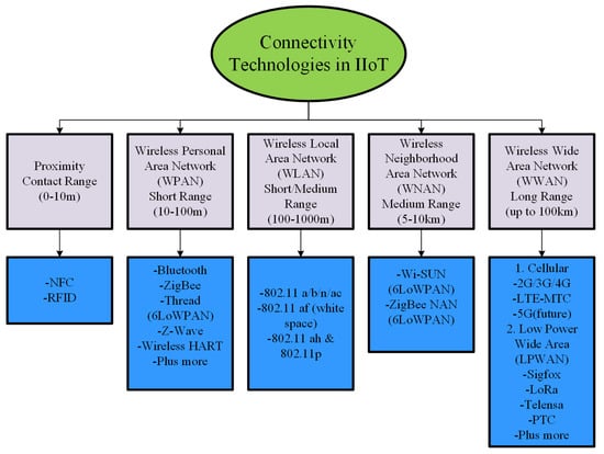 With the use of advance technologies of wireless communication, diverse new emerging protocols and architectures are supporting automated industry 4.0 development. Resources can be efficiently used after integration of communication technology and big data processing in real time, this will result in better performance. Industry 4.0 development involves many communication technologies; however, big data, IoT, 5G, mobile computing and cloud/fog/edge computing are the key enabling technologies [2,34,35]. An extensive range of IIoT projects have been deployed in domains of building automation, manufacturing systems, health care systems, transportation systems, processing food and agricultural systems in the past few years. Reaching a common task in an IIoT application; sensing, integration, and communication are main steps. RFID tags are used for sensing, network topologies and protocols are used for communication. All these smart devices are associated with each other using internet. Many connectivity technologies are available for supporting IIoT applications. Critical requirements of IIoT applications have many open challenges in all domains (smart grid, smart cities, smart devices, D2D, healthcare) such as capacity, real-time connectivity, remote maintenance and topology of communication networks. Figure 6 gives a general overview of technologies to connect things to the Internet, representing short-range and long-range wireless technologies. All technologies work differently with aim of low-latency, low-power consumption, low-bandwidth requirement, and reliable communication.