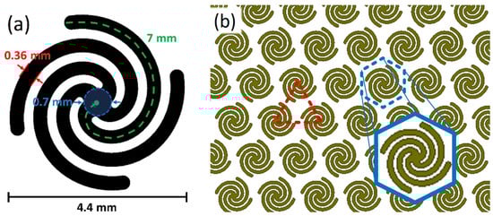 It is difficult to predict the aggregate effect of defects on the frequency response of the FSS a priori. To understand the effect of each defect on RF performance, we performed parametric simulations in Ansys HFSS using a single spiral unit cell with a range of arm lengths, arm widths, and center radii. A representative conductivity of 22,500