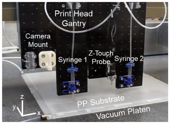 Print setup denoting syringe placement and size for extrusion direct-ink write process.